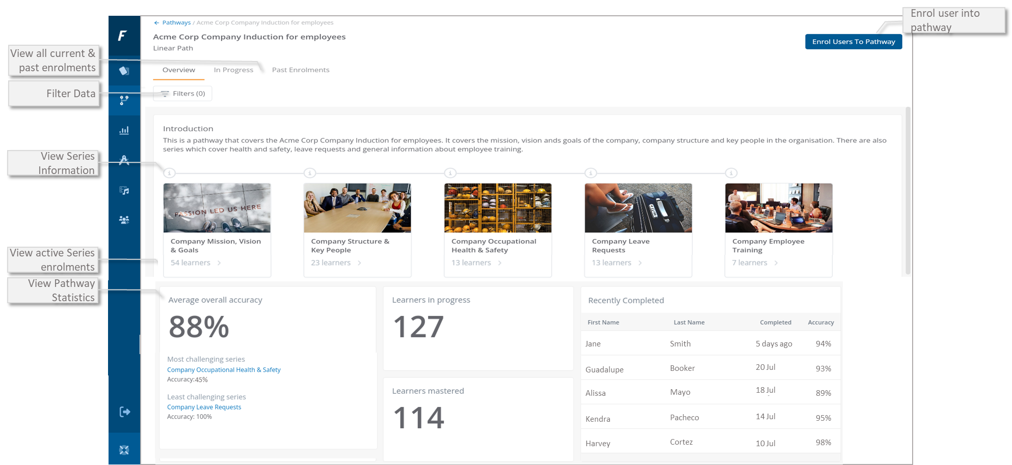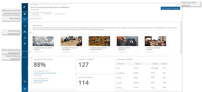 Learn how the Learning Pathway Overview displays general information about the pathway which includes an stats, an introduction and which order Series will be delivered to the learner.