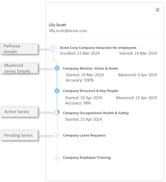 Learn how the Pathway Progression Details can visualise how a learner is progressing in the pathway. Which series is the current In Progress series, which has been mastered and what is coming next.