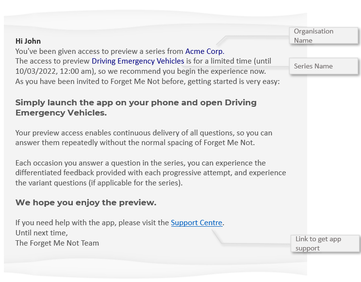 ✅ Existing learners are those that have previously been enrolled in a Series and should have already installed the app and signed-in. Links to the App Stores and Support Centre are also provided in case this hasn't been done.