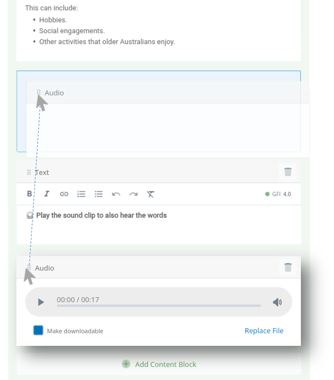 - Go to the content block that needs to be moved and click and hold the drag handle