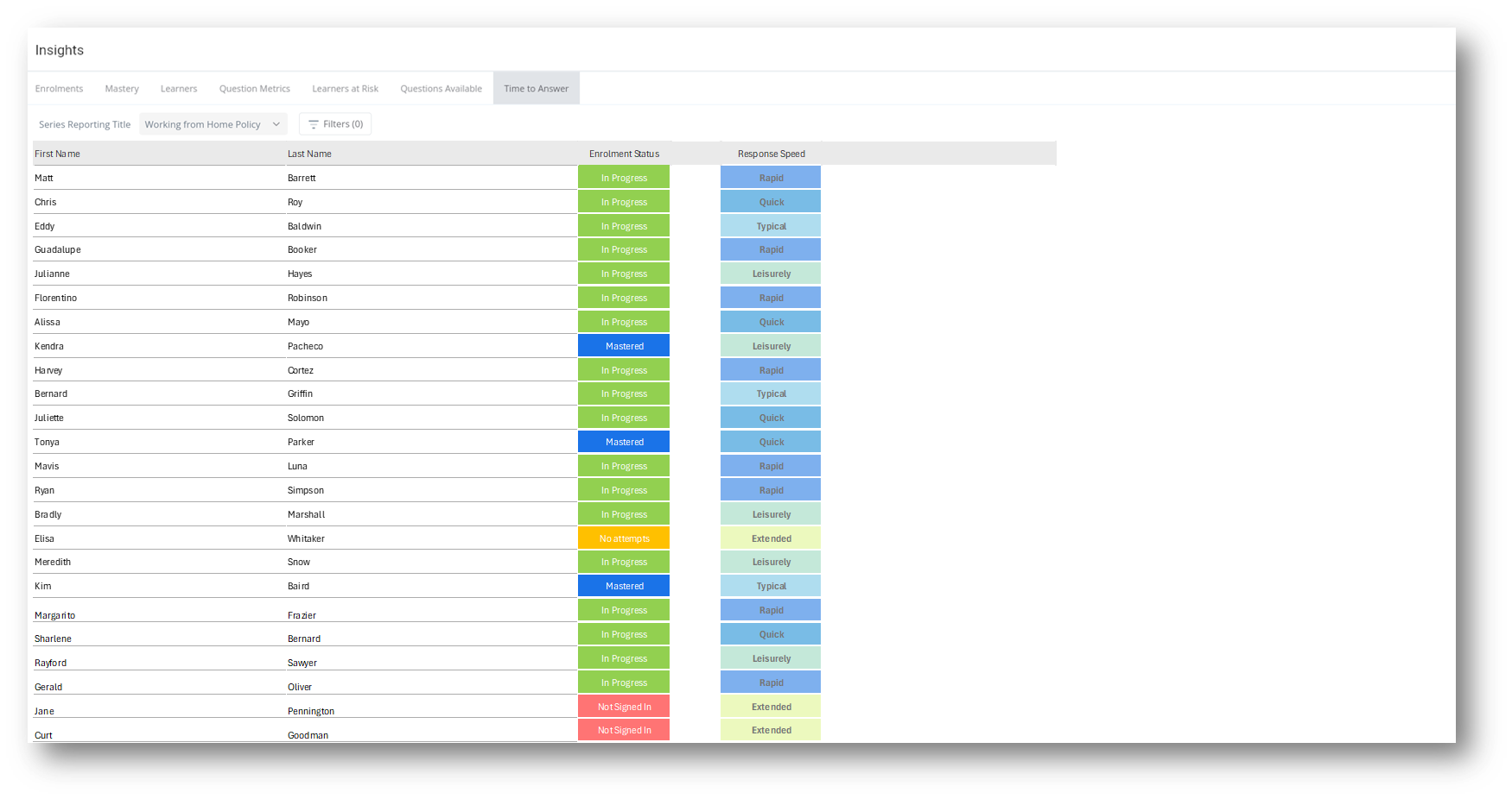 The time to answer report shows the enrolment status and responsiveness of learners answering questions within enrolments.