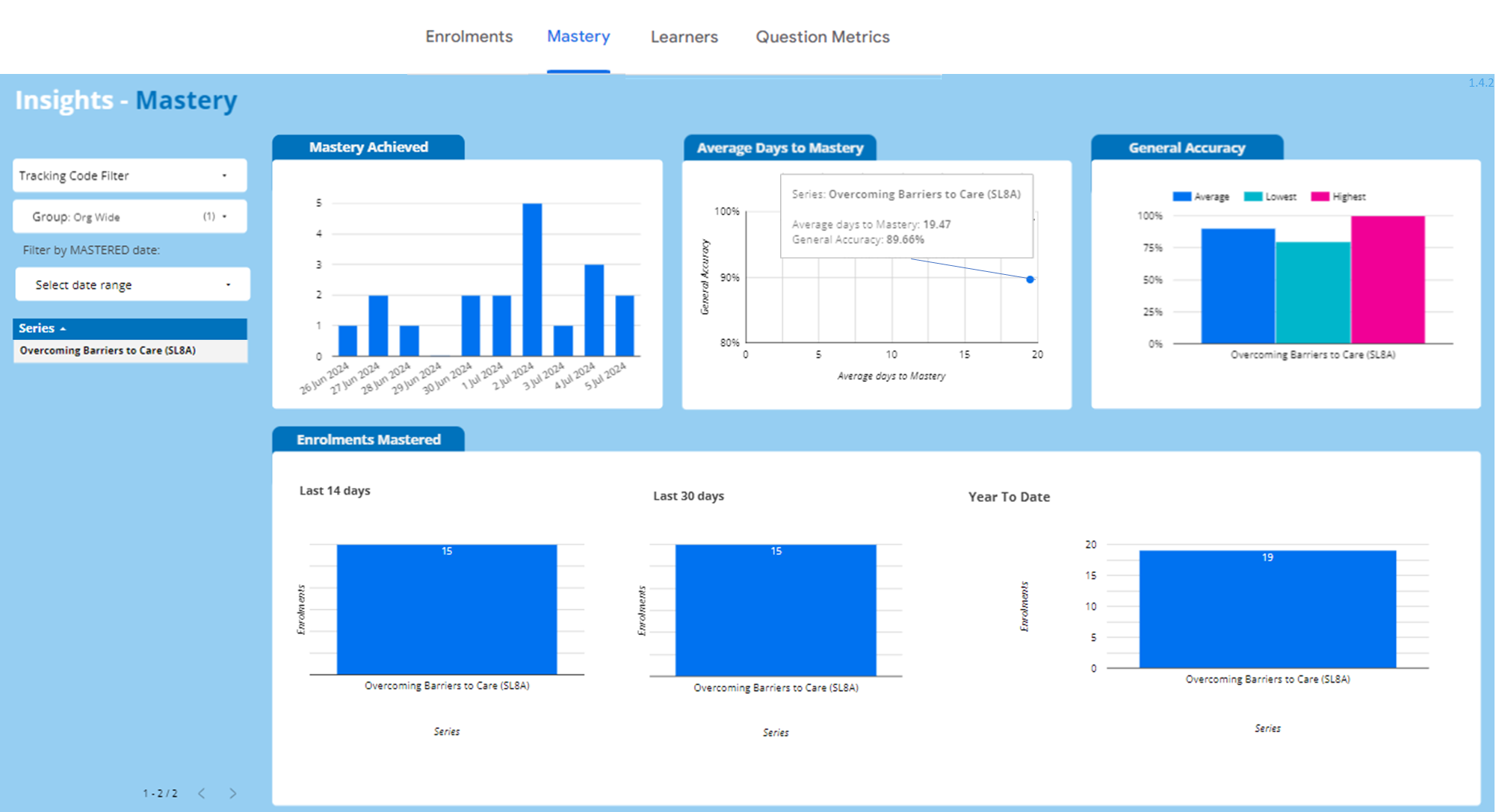 • Average Days to Mastery - calculated based on the date that learners first answered a question until they master the series.