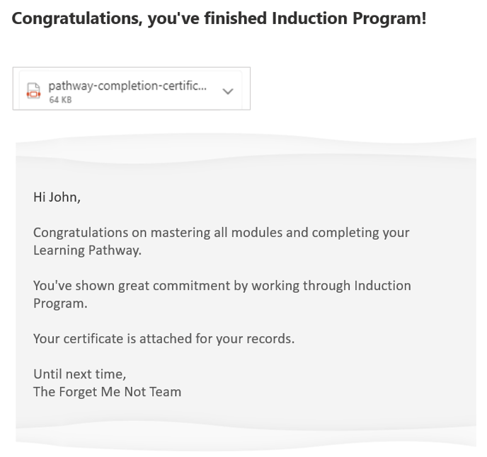Learn how the Learning Pathway completion email provides a certificate of completion for the acknowledgement that all series in the Learning Pathway have been completed