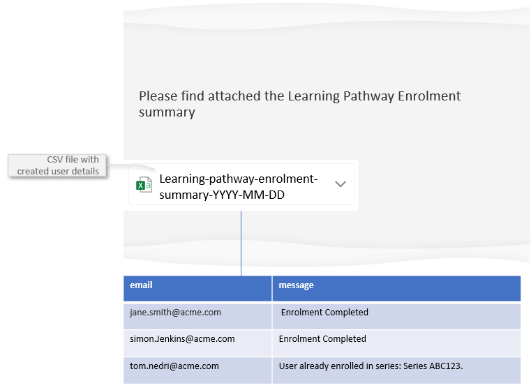 Learn how the learning pathway enrolment summary admin email provides pathway enrolment details to the admin user after the enrolment is processed