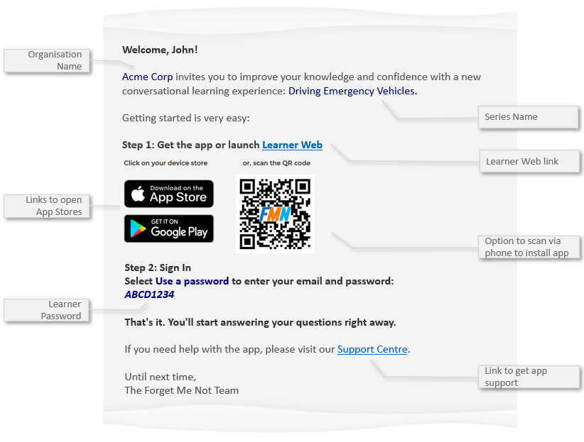 The initial enrolment email is sent from no-reply@forgetmenot.chat and contains the following key information: