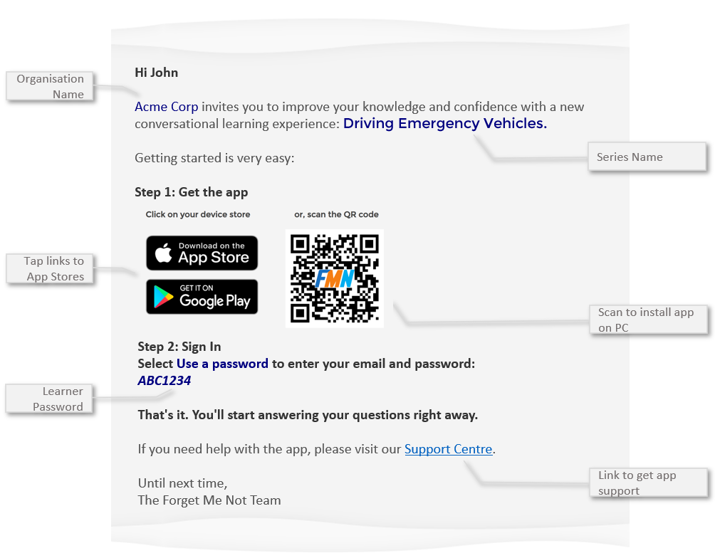 ✅ The invitation email also tells you the 1. name of the learner, the 2. organisation that sent the invitation and 3. what Question Series you have been enrolled in along with your 4. sign in password.