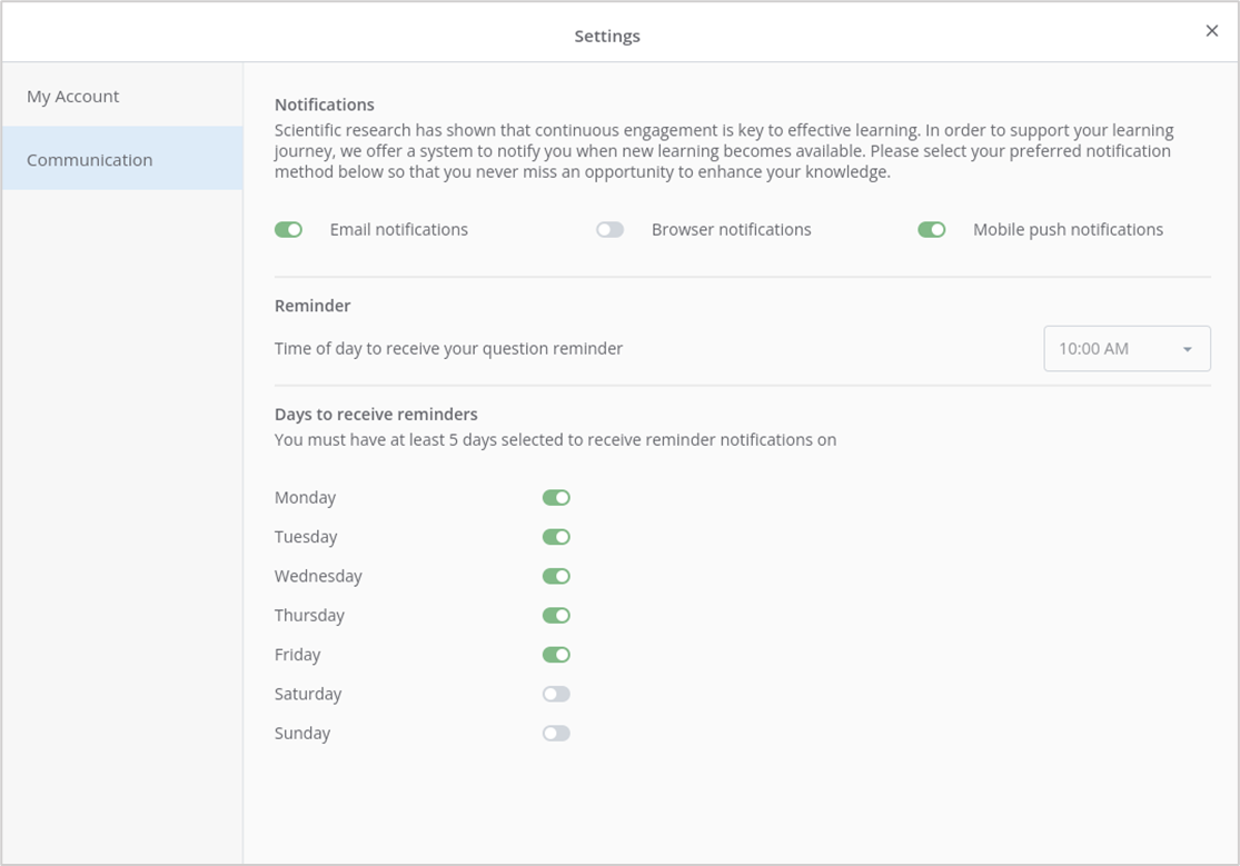 Once you've signed in to Learner Web you can easily check your communication settings including notification options, days and time to receive questions.