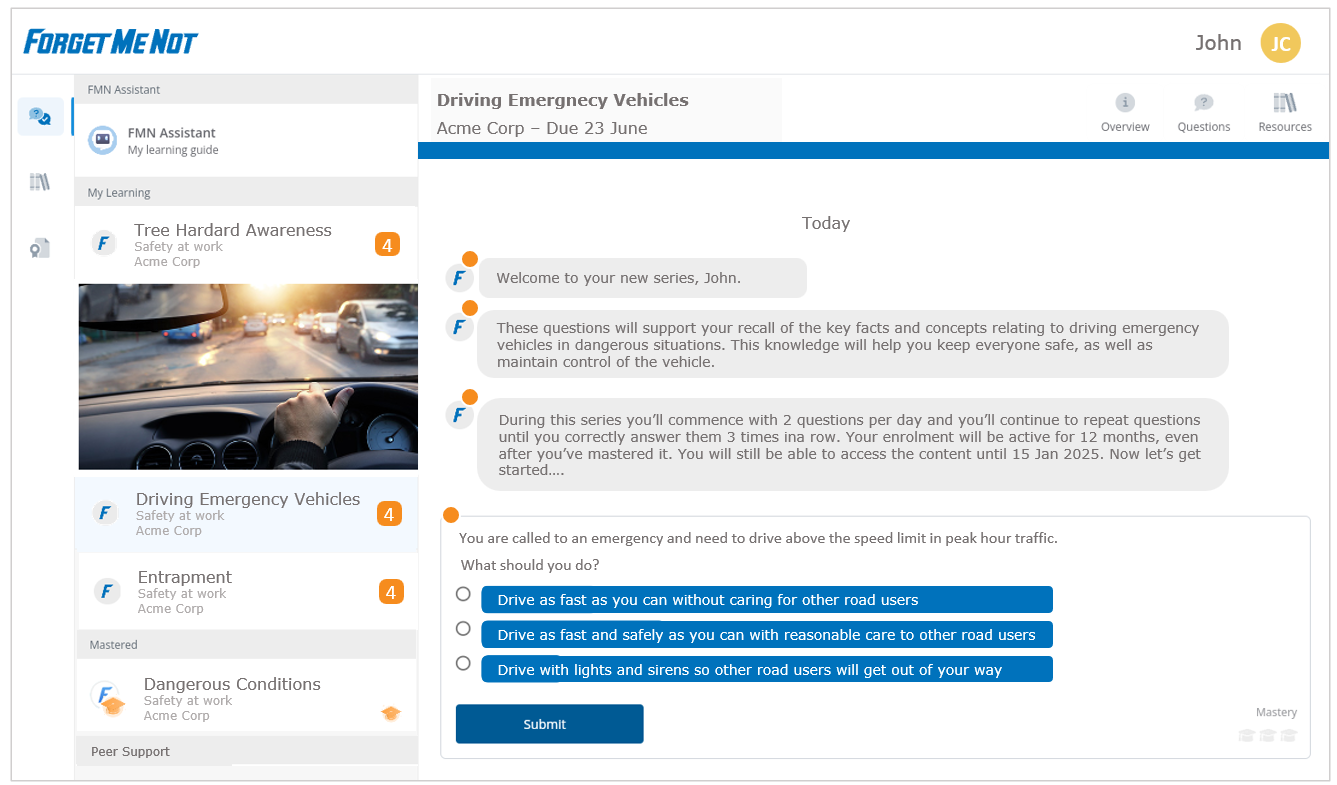 My Learning is the main screen in Learner Web that shows the FMN Assistant and lists all Question Series