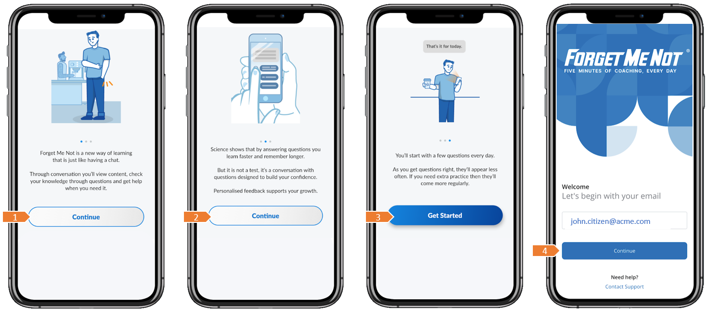 ▶️ Open the Learner App and step through the introduction screens to get to the Let's Begin with your Email screen, enter your registered email and tap continue