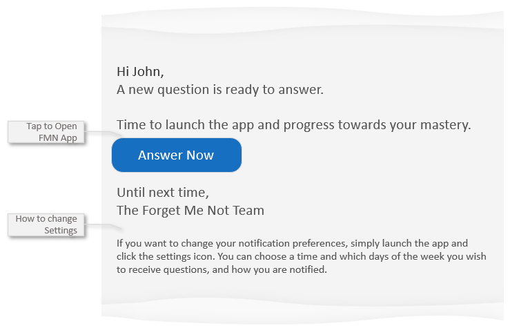 Learn how the 'next question waiting' email provides a notification that a new question is ready to answer. Use the Answer Now button to open the app and start answering questions