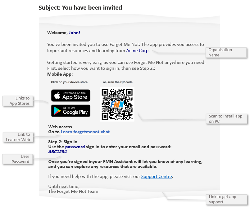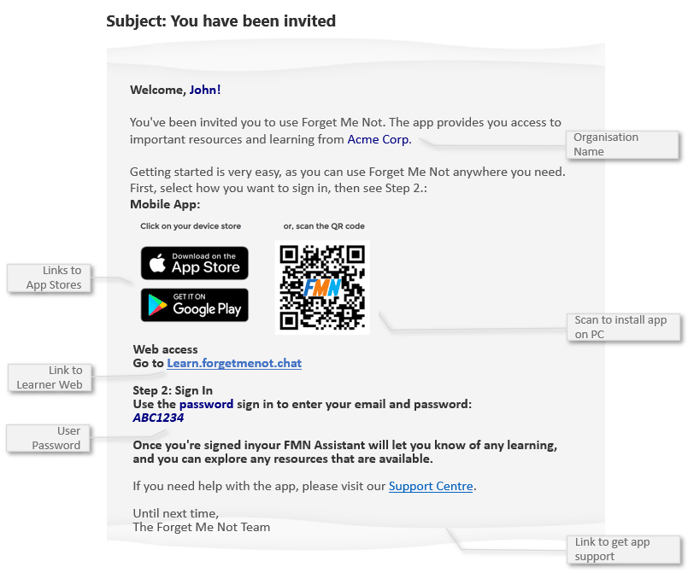 Learn how the invited organisation user welcome email provides all the details a new user needs to access Forget Me Not® with a password