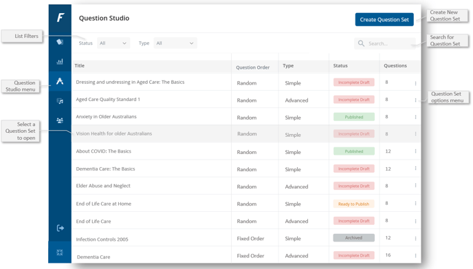 Learn how the Question Studio shows a list of authored Question Sets with type and status and provides options to create and edit question content