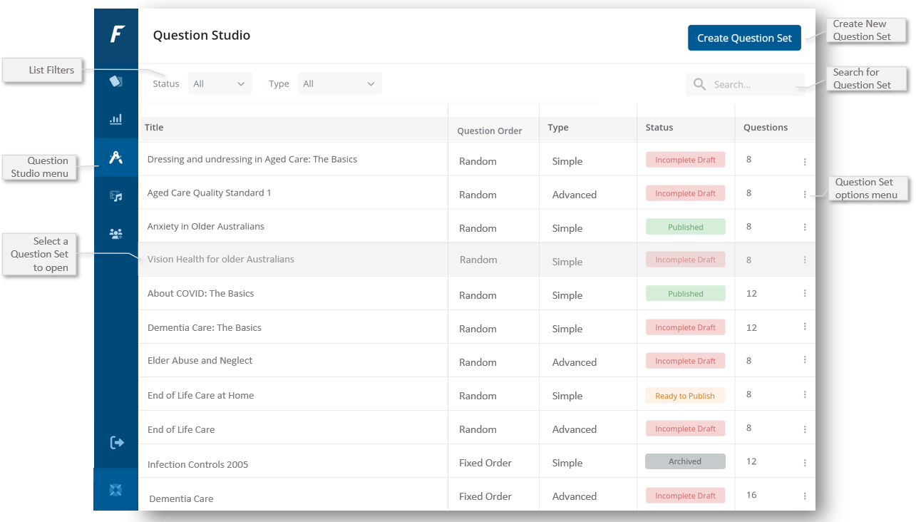 ▶️ Select Question Studio from the left-hand menu to see a list of all Question sets. The list contains all the question sets created by your organisation.