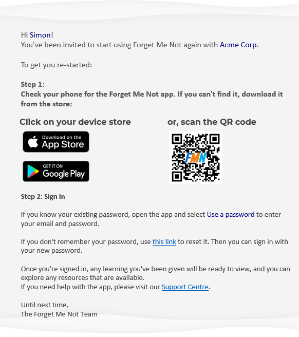 Learn how the reactiviated organisation user welcome email provides all the details a reactivated user needs to access Forget Me Not® or reset their password