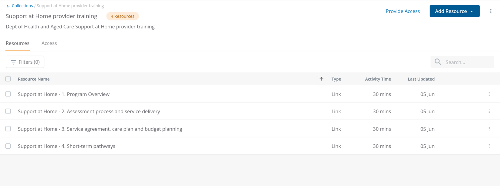 - Create a Resource Collection e.g. 'Support at Home provider training'