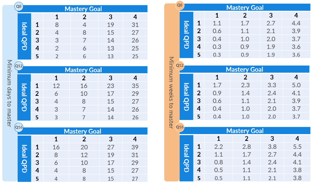 The following tables show the minimum mastery times in days (blue) and weeks (orange) for 8,12 and 16 Question Series, with each of the possible Mastery and Ideal Questions per day (QPD) values.