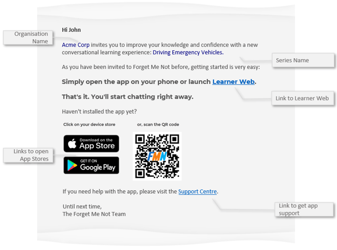 The enrolment email contains a link to access Learner Web, along with App Store links in case the user hasn't installed the app.