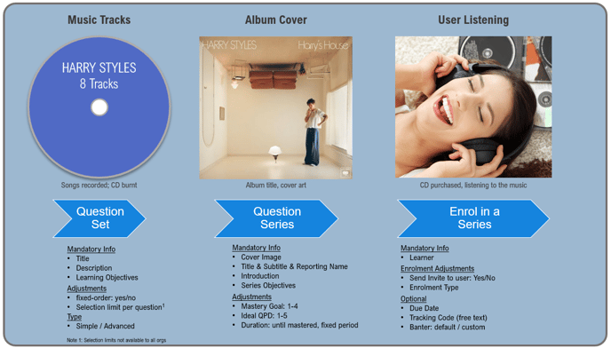 Another way of looking at Question Sets, Series and Enrolments is when we think of a music CD. A little old school now but if you think of the music tracks themselves, the album case and cover and then buying the CD and listening to it at home.