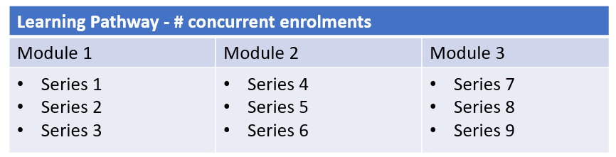 Different concurrent enrolment values can change the delivery of a learning pathway. Where the basic rule is that 'all series in a module must be completed before starting the next module'. Where concurrent enrolments is >1, then a series in the next module can also be active at the same time.