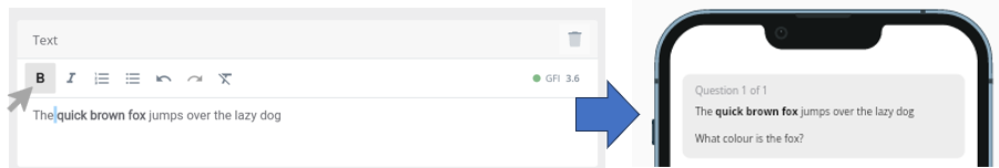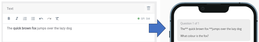 The Question Builder text editor has a bold function which must be applied to words without leading or trailing spaces. If you see your bolded text is showing as ** the quick brown fox **** instead of the quick brown fox, then this indicates that leading and or trailing spaces have been marked as bold.